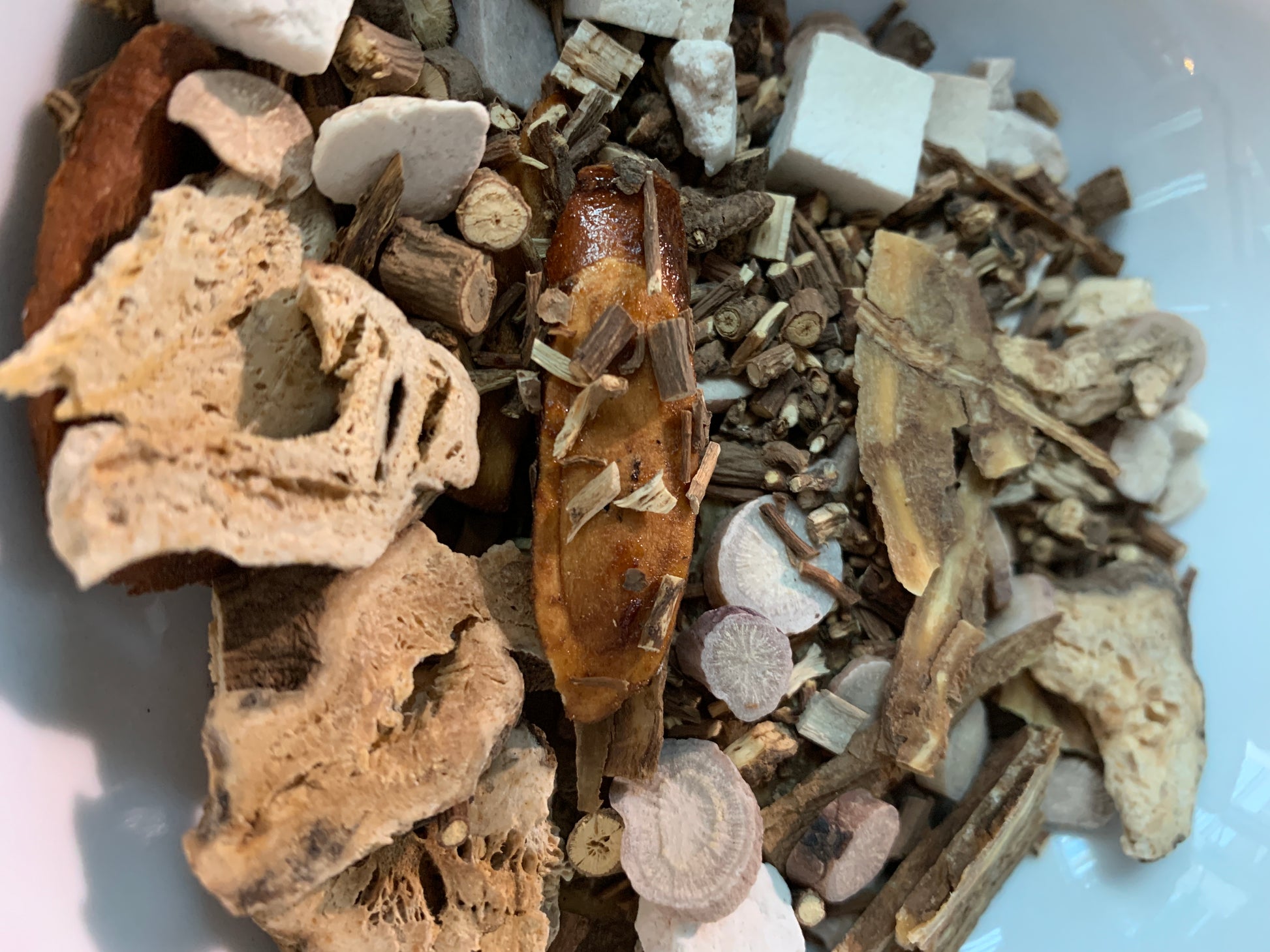 Chai Hu (Bupleurum root); Bai Shao Yao (White peony root); Dang Gui (Angelica chinensis root); Bai Zhu (Atractylodes rhizome); Fu Ling (Poria mushroom); Zhi Gan Cao (Honey-fried licorice root).